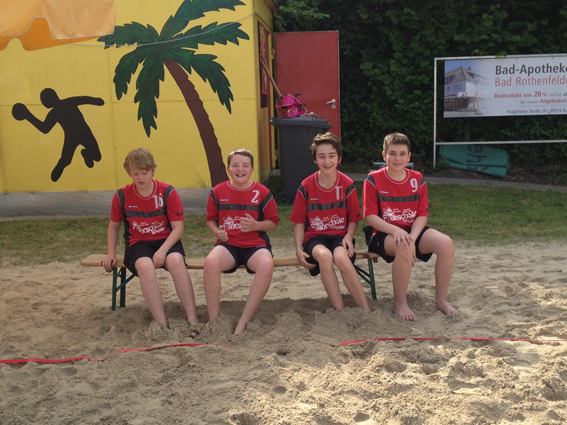Nachdem es aufgrund des schlechten Wetters im letzten Jahr leider nicht geklappt hatte, nahm die männliche C-Jugend der HSG an Jahrhundertpfingsten 2014 am Beachhandballturnier der Spielgemeinschaft Bockhorst-Dissen teil.Wir waren froh, dass es am Sonntagmorgen zu Turnierbeginn, noch nicht so heiß war. Gut eingecremt starteten wir bei herrlichem Sonnenschein und 25 °C in der Gruppe rot in das Turnier. Leider war uns schon vorher klar, dass wir aufgrund körperlicher Defizite nicht ganz viel reißen können, zudem spielten alle zum ersten mal im Sand Handball, was sich als deutliche Umstellung darstellte, weil einerseits ein anderes Regelwerk vorherrscht, andererseits der Bodenbelag seine Herausforderung mit sich bringt.