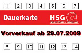 Ab dem 29. Juni 2009 können sich die Anhänger der HSG Augustdorf / Hövelhof ihre Dauerkarten für die kommende Oberliga Saison sichern. Dieses Jahr gibt es für alle Anhänger der HSG, die bis zum 10. Juli 2009 ihre Dauerkarte erworben haben, einen Frühbucherrabatt in Form eines 5,00 Euro Getränkegutscheines. Die Dauerkarten können in der HanseMerkur Geschäftsstelle Blüsse (Pivitsheider Str. 10) erworben werden.Das Dauerkartenangebot der HSG Augustdorf / Hövelhof besteht wie in der letzten Saison aus: