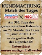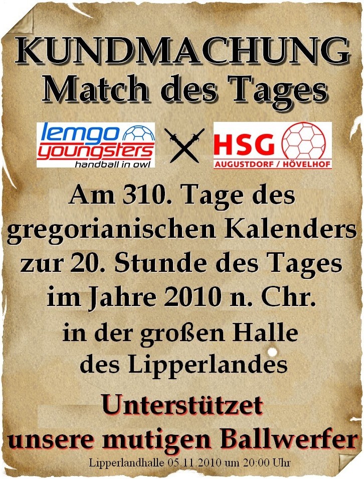 Begleiteten zu diesen Spielen bisher (wegen der Ferne) nur einige Augustendorfer mit Pferdewerken oder motorisch angetrieben Fuhrwerken unsere Werfer in der Fremde, so hoffen wir, das Augustendorfer Handballvolke möge mehr als zahlreich seine Ballwerfer in die Stadt der Hexen und Hanseleute begleiten. Dauert doch die Fahrt oder der Weg zu Fuße dorthin nicht lange. Man berichtet, dass der Weg zu Fuße nicht länger als der Kirchgang am Sonntage dauere. Als Anreiz dazu wird berichtet, dass es dort auch Speis und Trank für wenige Groschen geben soll (u.a. geplatzter Mais mit Zucker versüßt – soll Popcornius heißen) und man auch im Falle einer Niederlage gestärkt den Weg zurück antreten kann. Nun sind wir auf dem Lande bescheiden und zahlen mit Groschen und Talern. Ihr werdet in der Fremde in Lemgo erleben, dass dort mit merkwürdig aussehenden Karten die Speis und der Trank an den Verkaufsständen ausgegeben wird. Da wir solches Treiben nicht gewohnt sind, wollen wir hoffen, man ist uns gnädig und lässt uns mit Münzen zahlen.