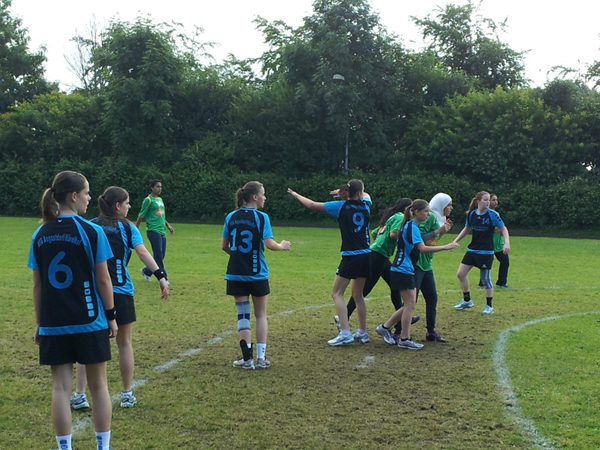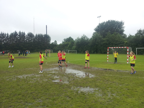 Gestern und heute ging es nach der Vorrunde weiter... Ausser der maennlichen B1, die in der Hauptrunde gespielt hat, sind alle anderen vier Teams in die Trostrunde eingezogen. Nachdem gestern schon Regenguesse das Spielen zu Rutschpartien gemacht haben, sind auch heute Morgen viele Spiele im wahrsten Sinne des Wortes ins Wasser gefallen. Riesige Pfuetzen rund um den Neunmeterkreis und erneuter Regen von oben machten das Handballspielen zu einer Schlammschlacht. Nur die U21 blieb mit ihren Spielen in der Halle vom kuehlen Nass von oben verschont.Trotz dieser Widrigkeiten hat es die weibliche B-Jugend bis ins Halbfinale geschafft und hier nur knapp - angefeuert von fast allen HSGlern, verloren. Glueckwunsch an die Maedels!