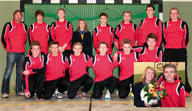 Die männliche A-Jugend der HSG Augustdorf / Hövelhof bedankt sich bei HB Horst Böger Tischlermeister aus Augustdorf für die neuen Kapuzenshirts.Als kleines Dankeschön überreicht Malte Fischer Kerstin Böger (kleines Foto) einen Blumenstrauß.