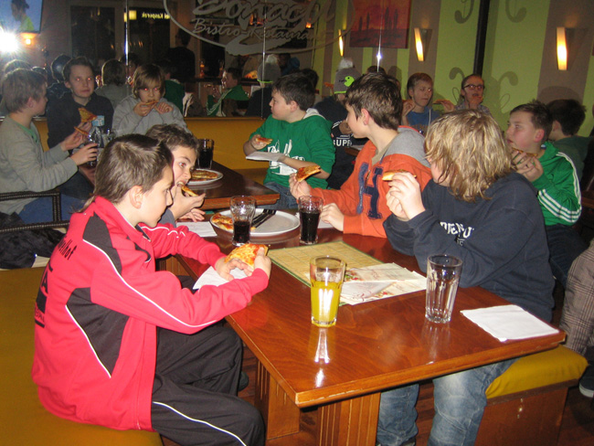 Nach einem verkürzten Training und einer schnellen Dusche traf sich die D-Jugend mit einigen Eltern und ihren Trainern im BONACA um das Spiel der Deutschen Nationalmannschaft gegen Frankreich zu gucken.[foto=../picpool/news/md_pizza2.jpg]