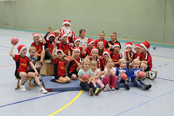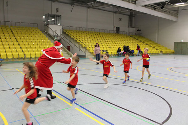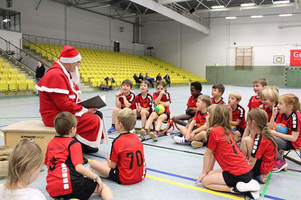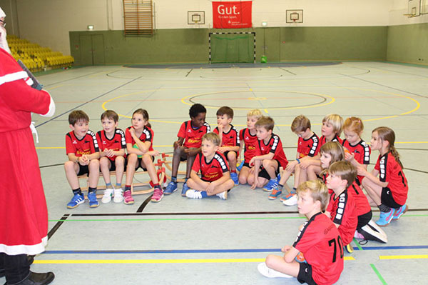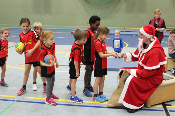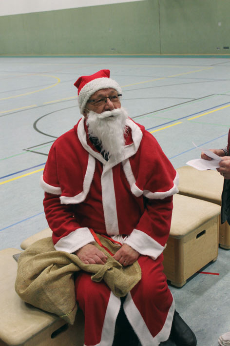 Nach einem sportlichen Abklatschen des Weihnachtsmannes fanden sich alle Kinder in der Mitte zusammen und sangen ein Weihnachtslied. Gemeinsam wurde ein Gedicht vorgetragen und anschließend bekamen alle Kinder eine süße Kleinigkeit aus dem großen Sack.Vielen Dank, lieber Weihnachtsmann für deinen Besuch!
